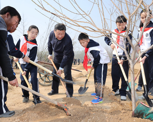 挥锹铲土填入树坑,培实新土堆起围堰,习近平接连种下白皮松、西府海棠、银杏、碧桃、榆叶梅。每种下一棵树苗,习近平都同少先队员一起提桶浇水,还不时询问他们学习生活的情况。习近平表示,我国历来就有在清明节前后植树的传统。全民义务植树的一个重要意义,就是让大家都树立生态文明的意识,形成推动生态文明建设的共识和合力。每年这个时候与同学们一起植树,感到很高兴。希望同学们从小树立保护环境、爱绿护绿的意识,既要懂道理,又要做道理的实践者,积极培育劳动意识和劳动能力,用自己的双手为祖国播种绿色,美化我们共同生活的世界。