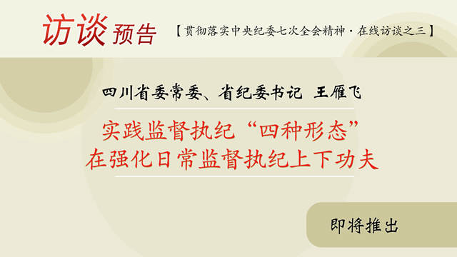 为贯彻落实中央纪委七次全会精神,近日,四川省委常委、省纪委书记王雁飞做客中央纪委监察部网站在线访谈,就“实践监督执纪‘四种形态’在强化日常监督执纪上下功夫”这一主题与网友交流,敬请关注。
