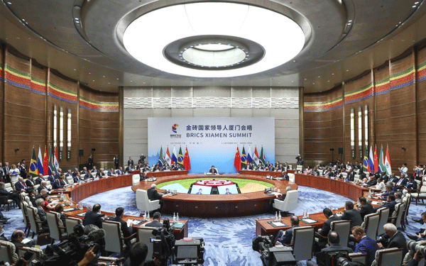 9月4日,金砖国家领导人第九次会晤在厦门国际会议中心举行。国家主席习近平主持会晤并发表题为《深化金砖伙伴关系 开辟更加光明未来》的重要讲话。(新华社记者 马占成 摄)