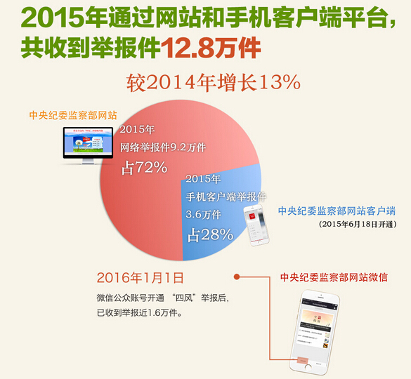 2015年,通过网站和手机客户端(2015年6月18日开通)平台,共收到举报件12.8万件,较2014年增长13%。其中,网络举报件9.2万件,手机客户端举报件3.6万件,分别占72%和28%。