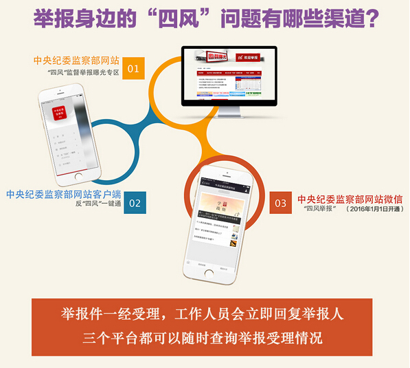 目前,中央纪委党风政风监督举报平台已形成了中央纪委监察部网站“四风”监督举报曝光专区、手机客户端“反‘四风’一键通”和微信“四风举报”组成的“一网一端一微”格局。